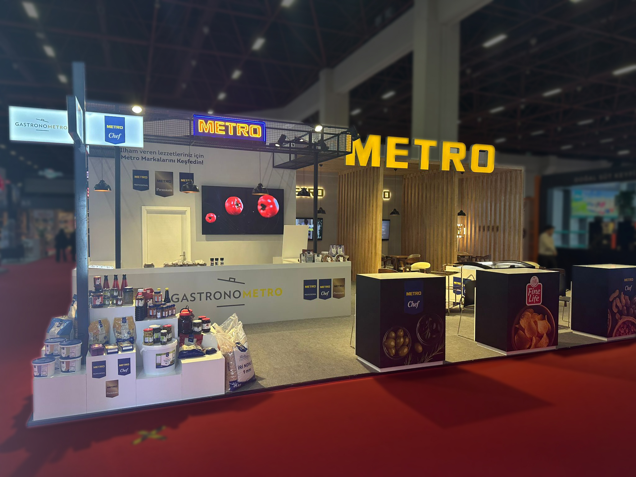 Metro Türkiye's booth at FoodProduct 2025 was created using reusable modular units, with a strong focus on sustainability and cost-efficiency. The units were arranged in a functional layout, and from wooden profiles to counter units, each piece is designed for reuse at future events.