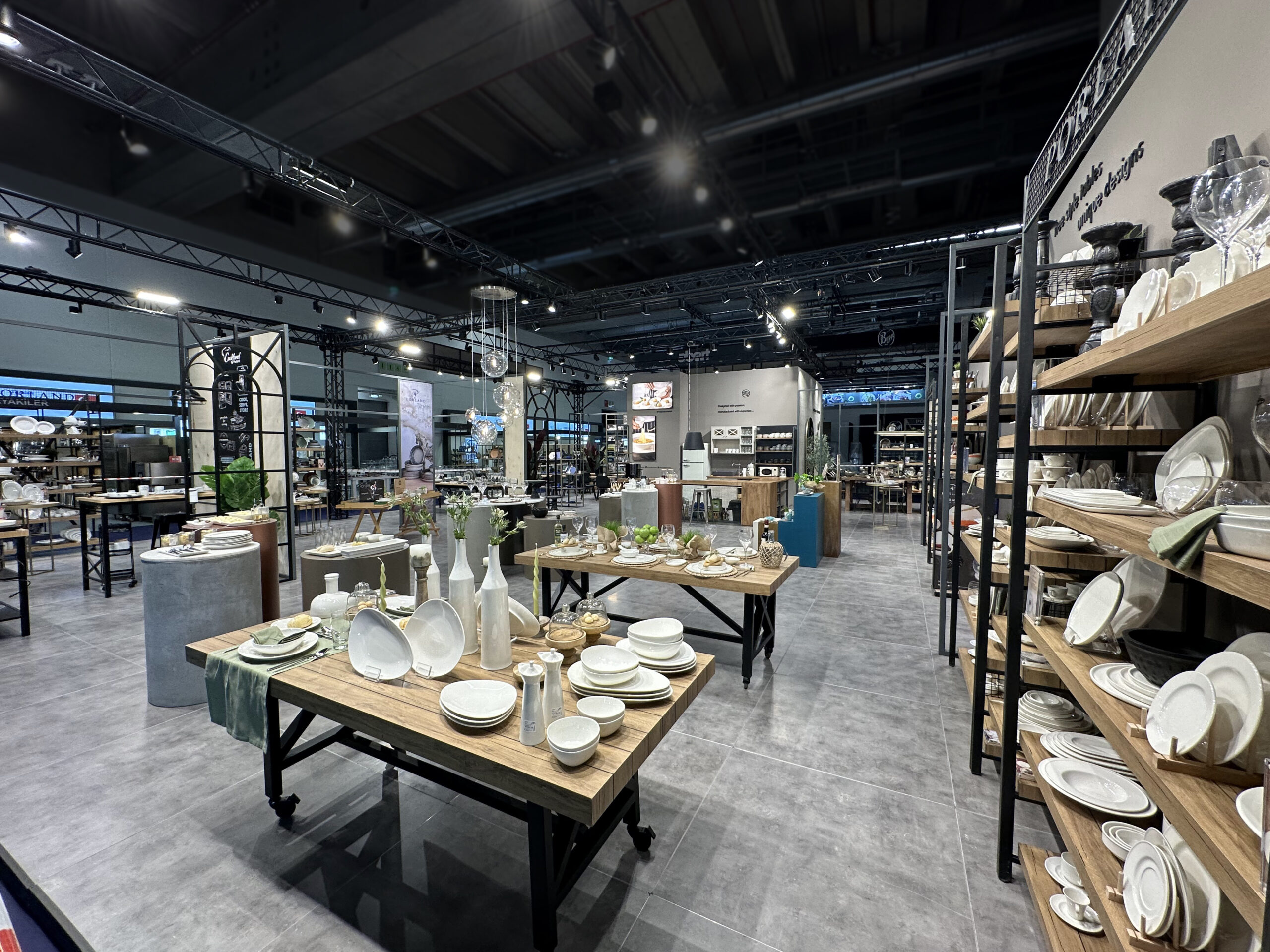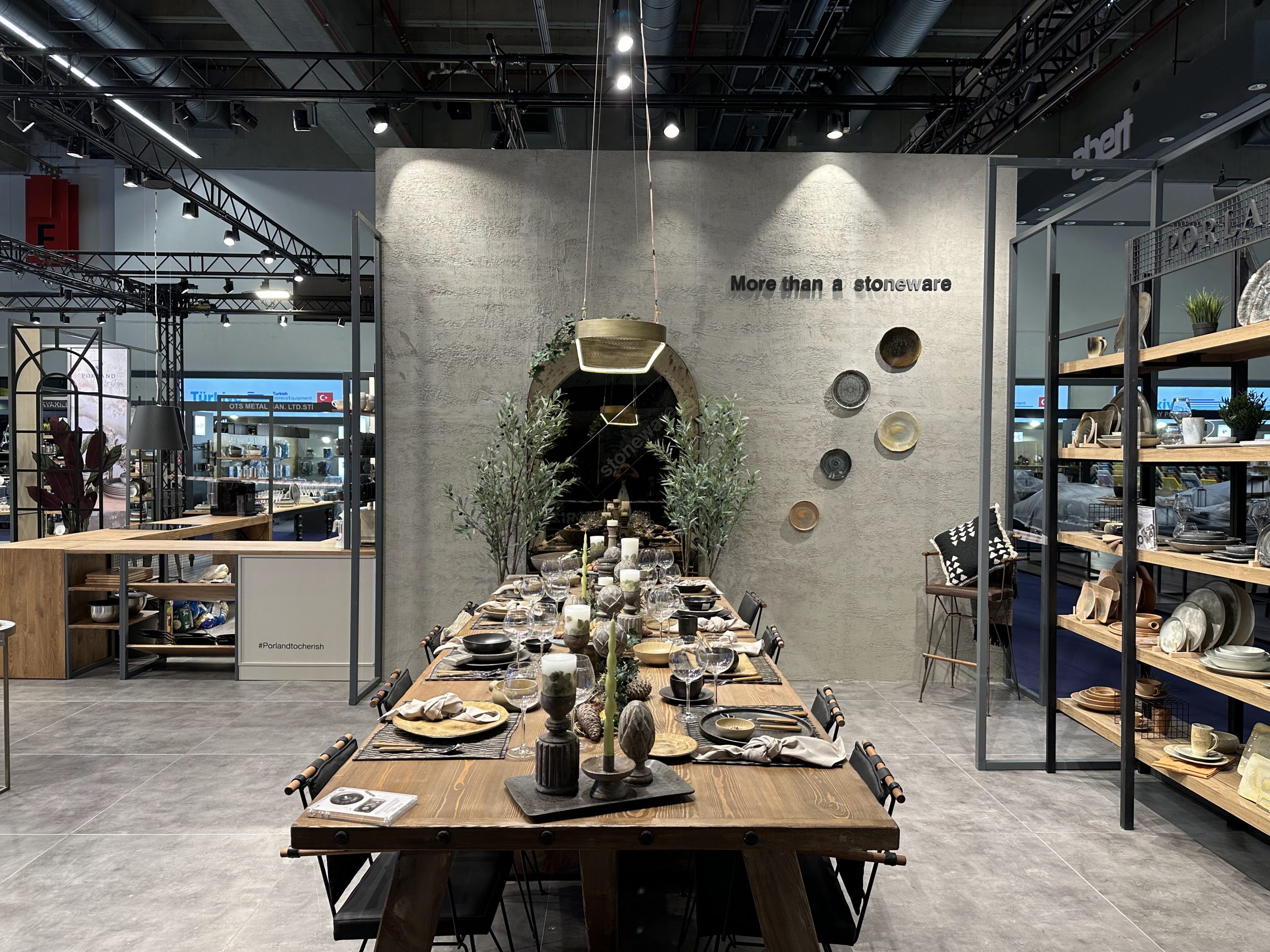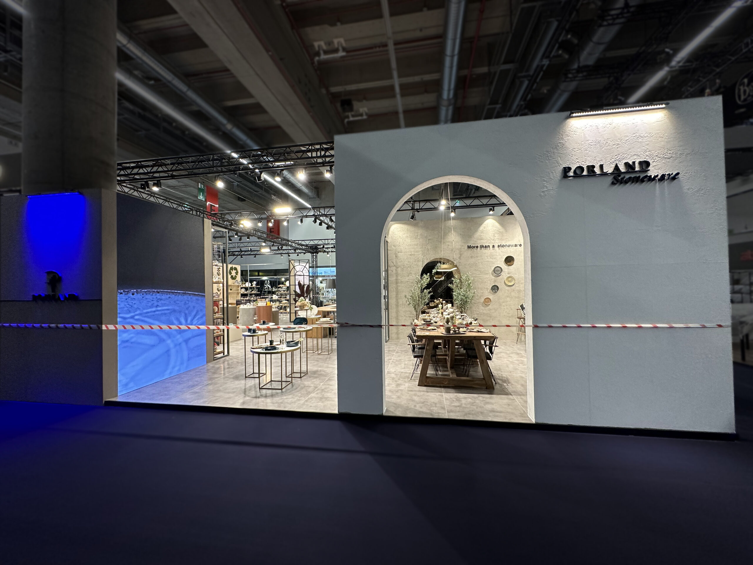 At Ambiente 2024, Porland showcased two distinct stands, each offering a unique showroom experience with dedicated corners for different product groups. Spanning 365 m² across two halls, the stands featured exhibition spaces that seamlessly combined various forms and materials in a fluid, cohesive design. A modular exhibition area was specifically created for the Re-gen series, made from recycled porcelain, emphasizing sustainability as a central theme. Different teams collaborated simultaneously to deliver comprehensive 360-degree fair management, covering everything from logistics and visual design to technical services and carpentry.